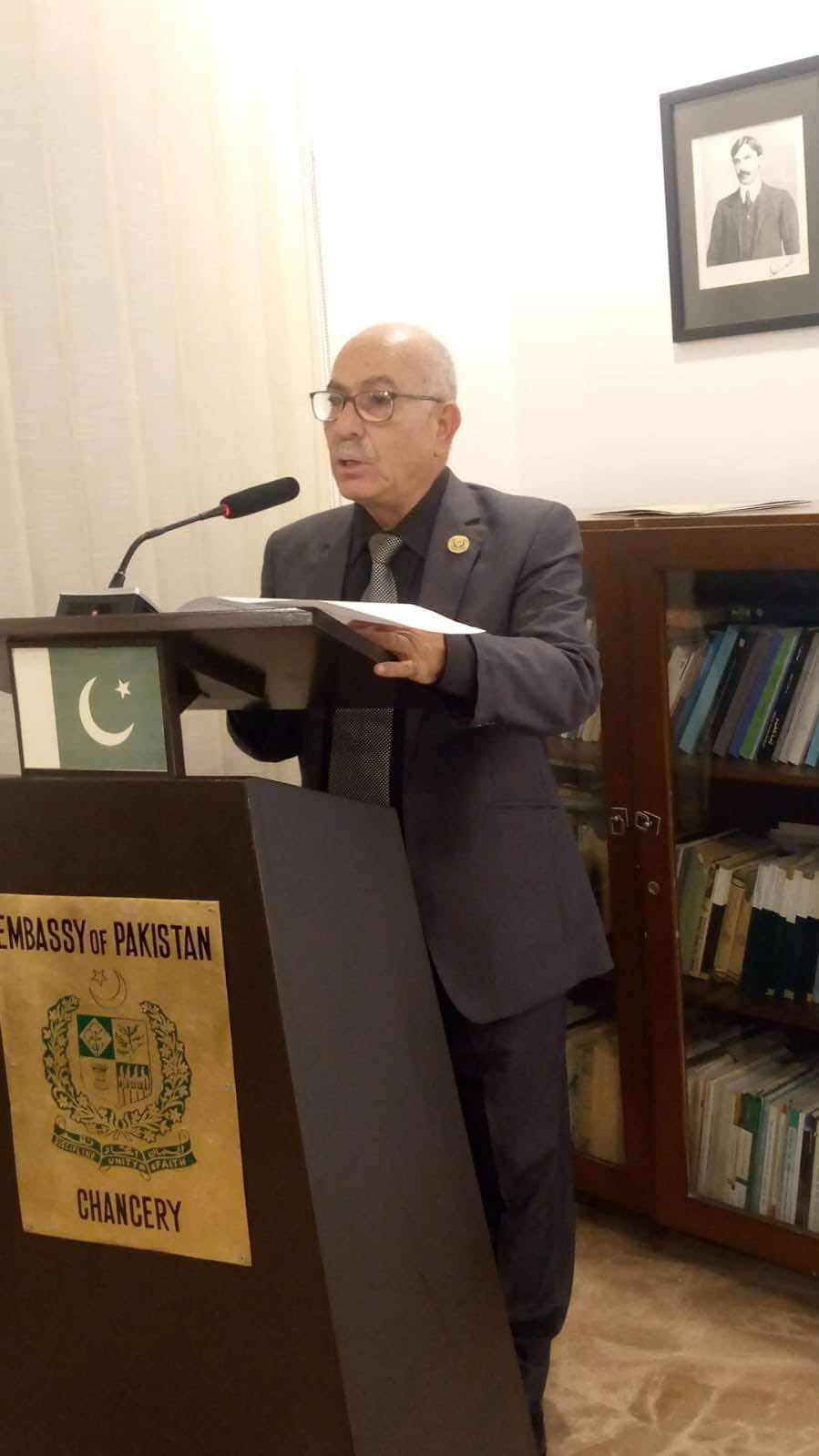 بعد ذلك قدم الأستاذ الجغبير عرضاً عن تاريخ القضية الكشميرية والتطورات الأخيرة التي حدثت من خلال إلغاء المادة الدستورية 370 من الدستور الهندي، والقيام بعملية ضم لإقليم جامو وكشمير واعتبار الإقليم ولاية من الولايات الهندية ضاربة الهند كافة القرارات الشرعية الدولية والاتفاقات التي تنص على أن إقليم كشمير أراضٍ متنازع عليها، كما بين ازدواجية المعايير الغربية بالتعامل مع القضايا الدولية، ودعا الى ضرورة إيجاد حل سلمي لهذه القضية الإنسانية العادلة.