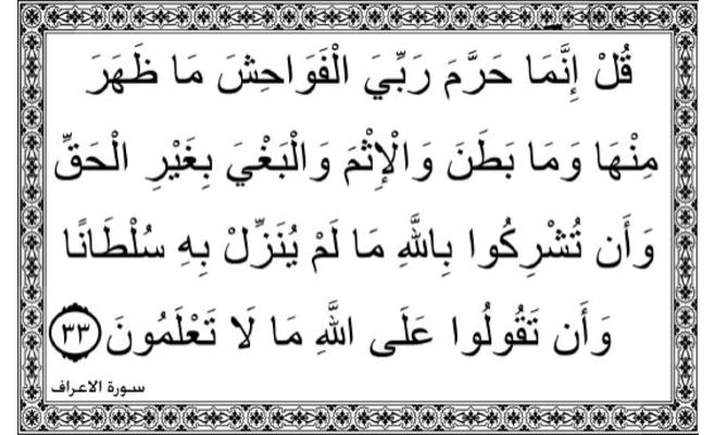 بين الله سبحانه في آية جامعة ما حرمه على الإنسان، فقال: "قل إنما حرّم ربي الفواحش ما ظهر منها وما بطن، والإثم والبغي بغير الحق، وأن تشركوا بالله ما لم ينزّل به سلطانا، وأن تقولوا على الله ما لا تعلمون"، بدأ بالفواحش ظاهرها وباطنها، مما يعلمه الناس ويجهلونه، وهي ذنوب لكن فحشها يشهرها ويسيء إلى دائرة أوسع من مقترفها، والفواحش جزء من الإثم الذي جاء ذكره بعدها، فهو خاص جاء بعده عام، والإثم كل ما نهى الله تعالى عنه، لكنه اقترن هنا بالبغي الدال على الكبر، ثم جاء ذكر الشرك الذي هو أكبر الكبائر، فلا يستحق الألوهية والربوبية والقصد إلا الله تعالى، فلا سلطان لغيره، ولا خالق غيره، فكل من سواه مخلوق، وأنى لمخلوق أن يكون إلها يُعبَد من دون الله! وأخيرا يذكر الله ما يفتريه الناس على الله، سواء من ادعاء آلهة، أو التحليل والتحريم، وغير ذلك.