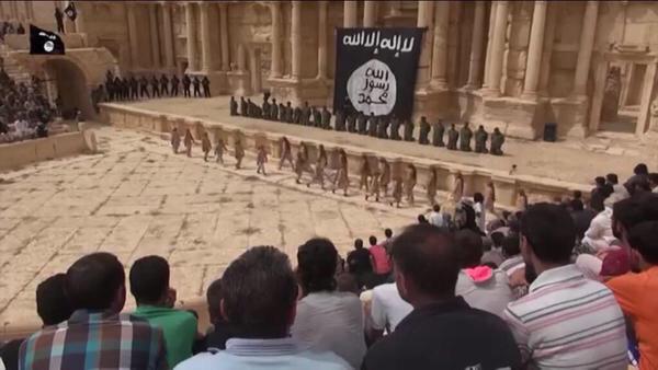 بث تنظيم داعش السبت فيديو يظهر إعدام 25 من قوات نظام الأسد وسط آثار مدينة تدمر، وتحديدا في مسرحها الروماني.