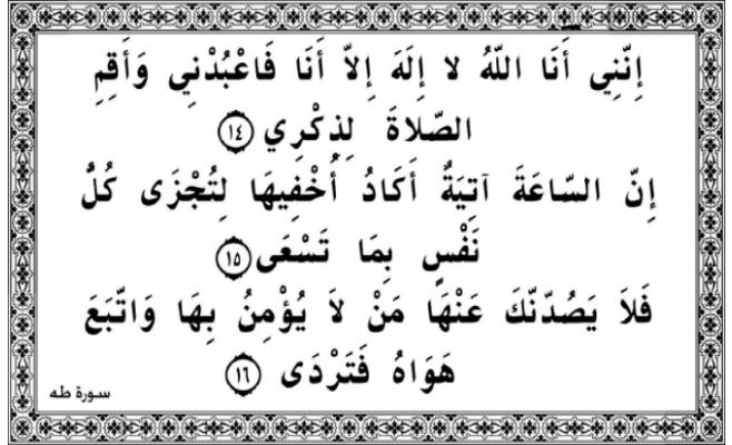 إن قضية الإيمان بالله عز وجل قضية مركزية في القرآن الكريم والإسلام وتناولته مئات الآيات ومنها قوله تعالى: "إنني أنا الله لا إله إلا أنا فاعبدني وأقِم الصلاة لذكري" (طه: 14)، حيث كانت هذه الآية خطابا من الله عز وجل لكليمِه موسى عليه السلام في وادى طُوى المبارك حيث عرفه بنفسه "إننى أنا الله"، وفي هذا تعريف للبشرية كلها أيضا بجعلها آية تتلى آناء الليل وأطراف النهار حتى تقوم الساعة.