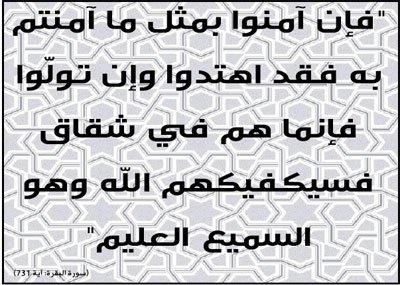 ولنختبر مدى توافق هؤلاء في الاحتكام للقرآن الكريم مع آية واحدة كنموذج ومثال، فالله عز وجل يخاطبنا -معشر المسلمين والمسلمات- بقوله تعالى: “فإن آمنوا بمثل ما آمنتم به فقد اهتدوا وإن تولّوا فإنما هم في شقاق فسيكفيكهم الله وهو السميع العليم” (البقرة: 731).