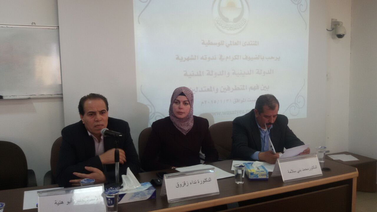 اقام المنتدى العالمي للوسطية اليوم السبت 31/1/2015 ندوته الشهرية حول "" وقد استهل المهندس مروان الفاعوري امين عام المنتدى الندوة بالترحيب بالضيوف الكرام محاضرين ومشاركين متطرقاً لنبذة تاريخية عن الدولة الدينية والدولة المدنية مستعرضاً لبعض التجارب في هذا المجال كالتجربة التركية .