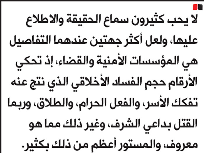 أعلم أن ما أكتبه يزعج كثيرين، ولا يحب كثيرون سماع الحقيقة والاطلاع عليها، ولعل أكثر جهتين عندهما التفاصيل هي المؤسسات الأمنية والقضاء، إذ تحكي الأرقام حجم الفساد الأخلاقي الذي نتج عنه تفكك الأسر، والفعل الحرام، والطلاق، وربما القتل بداعي الشرف، وغير ذلك مما هو معروف، والمستور أعظم من ذلك بكثير.