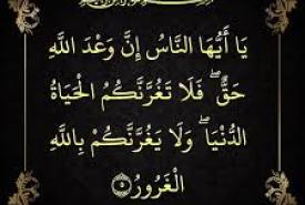 ﴿ يَا أَيُّهَا النَّاسُ إِنَّ وَعْدَ اللَّهِ حَقٌّ فَلَا تَغُرَّنَّكُمُ الْحَيَاةُ الدُّنْيَا وَلَا يَغُرَّنَّكُمْ بِالل
